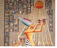 Le Due Terre sono ogni giorno in festa, gli uomini sono desti e si levano in piedi, poiché tu li hai fatti alzare. Il loro corpo è pulito e hanno indossato abiti, le loro braccia si levano in preghiera al tuo sorgere la terra intera compie la sua opera. Tutto il bestiame si pasce del proprio foraggio, alberi ed erbe verdeggiano, gli uccelli hanno lasciato i nidi, i loro voli lodano il tuo Ka.